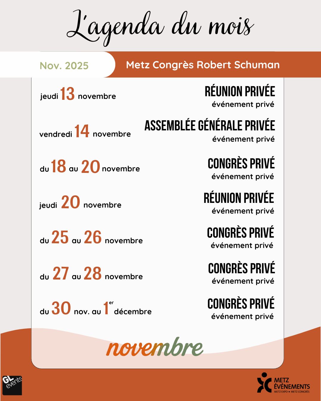 - Du mardi 25 au mercredi 26 novembre : Congrès privé